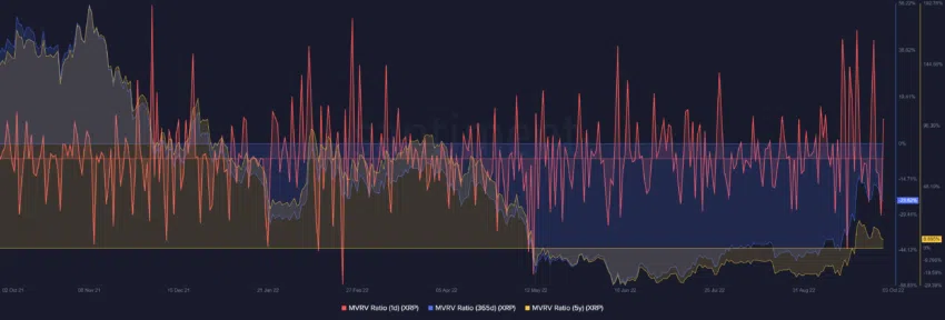 Des valeurs faibles du MVRV indiquent un degré moindre de bénéfices non réalisés au sein du système, ce qui pourrait indiquer soit une sous-évaluation, soit une mauvaise dynamique de la demande. Au moment de la mise en page, alors qu’une reprise à court terme semblait plausible la dynamique de la demande de XRP restait relativement faible sur le graphique à long terme.