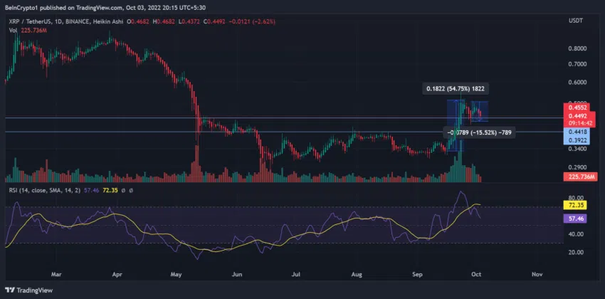 La course flamboyante du cours de XRP au-dessus de la résistance clé de 0,5 $ s’est toutefois heurtée à une pression importante de la part des bears, le token ayant subi un repli de 15 % depuis son niveau supérieur, et planant au niveau de 0,4507 $ au moment de la mise en page de cet article.
