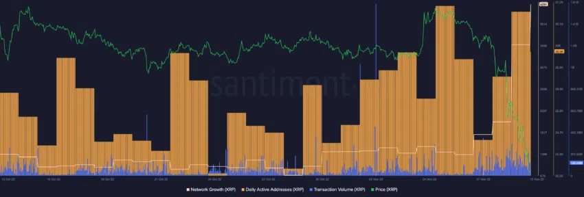 Les adresses actives quotidiennes (DAA) on enregistré une hausse massive, montant à 48 666 le 13 novembre, en tandem avec les importants volumes de transactions. Cependant, les DAA ont chuté de plus de 25 % en un jour, ce qui pourrait présager des difficultés à venir pour la pièce.