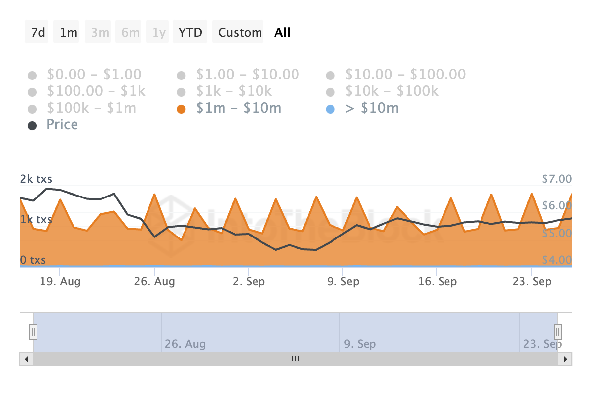Selon les données d’IntoTheBlock, le nombre de transactions de TON évaluées entre 1 million et 10 millions de dollars a grimpé en flèche de 179 % au cours des 30 derniers jours. De même, les transactions plus importantes dépassant 10 millions de dollars ont connu une impressionnante hausse de 83 % pendant la même période.