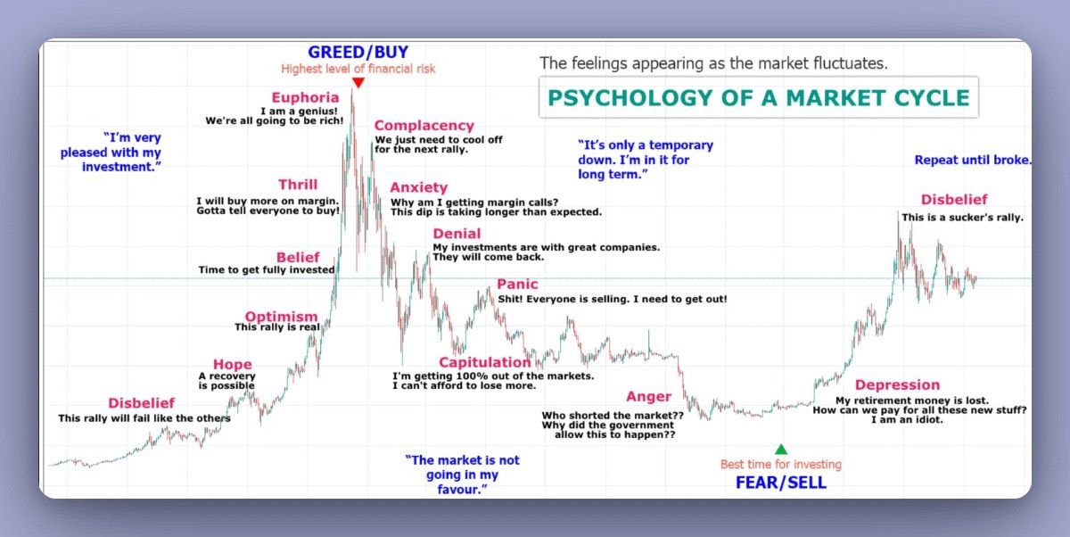 Le marché crypto est profondément influencé par les états psychologiques de ses participants, principalement guidés par la cupidité, la peur et la peur de rater une opportunité (FOMO). Ces émotions catalysent les cycles haussiers et baissiers qui caractérisent le marché, démarrant avec un optimisme à mesure que les prix montent, évoluant vers l’anxiété au sommet, et culminant souvent en panique lorsqu’ils chutent brutalement. Chaque état émotionnel soutient la nature volatile du marché, offrant ainsi des opportunités et des risques dans l’environnement du trading crypto.