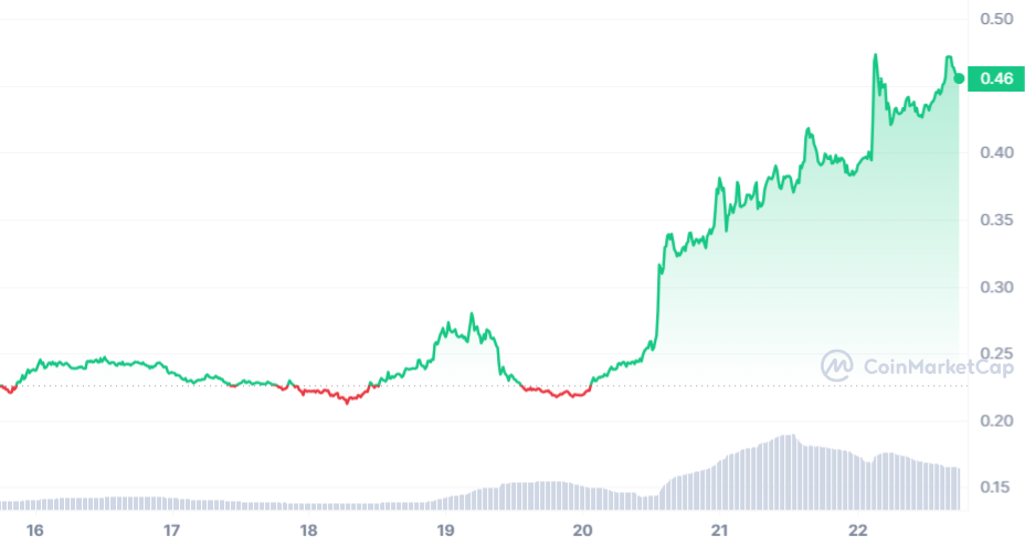 En termes de cryptomonnaies haussières, on en a vu de toutes les couleurs cette semaine. Mais au-delà des plus classiques comme Solana ou Injective, le BAKE a dans la discrétion fait son bout de chemin. En effet, puisque comme en atteste ce graphique hebdo, le BakeryToken a doublé sa valeur en très peu de temps. Au moment de rédaction, la pièce s’échange à 0,46 $.