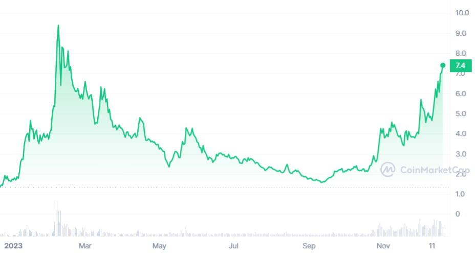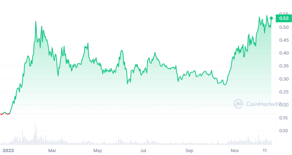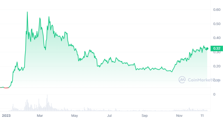 On entame ce tiercé avec la crypto IA qui réalise la meilleure performance sur ce dernier mois. En effet, après un début d’année hors du commun, OrainChain et son jeton ORAI ont connu un très beau passage à vide. Après une longue traversée du désert jusqu’au mois d’octobre, ORAI a enclenché la première, la deuxième et la troisième. Même si la pièce est encore très loin de son ancien ATH de 2021, elle est en forme en 2023 : 459 % de hausse.
