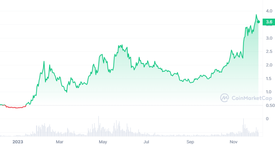 Troisième crypto nommée de cette liste, le RNDR est pourtant l’altcoin qui a le plus augmenté des trois. Mais surtout, sa hausse a été régulière, avec plusieurs explosions tout au long de l’année.