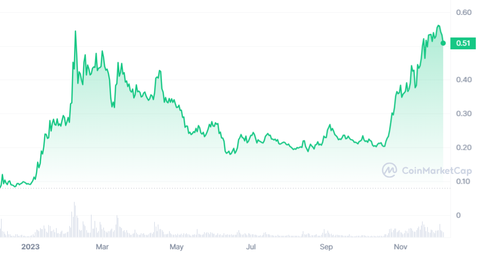 Le projet, lancé il y a quelques années, est une plateforme ouverte pour intégrer l’économie de l’IA. Grâce à ces plateformes et à ces services en lien avec l’intelligence artificielle, quiconque peut créer et déployer des services à grande échelle. Alors qu’au-delà des fondamentaux, la hype sert beaucoup à alimenter la hausse, FET a gagné 454 % depuis le 1er janvier. Cette hausse sensationnelle a fait grimper le cours du jeton à 0,51 $.