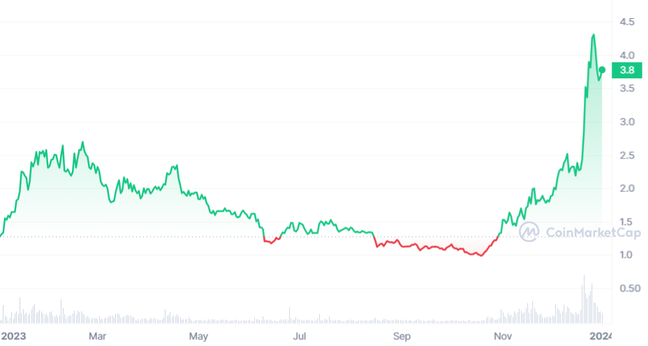 Après une chute progressive et dépressive tout au long de l’année 2023, la fin d’année a été une bouffée d’air frais pour le NEAR. Le jeton de cette crypto layer-1 a enfin pu prendre son envol, et signer plus de 200 % de hausse très rapidement. Actuellement à 3,77 $, NEAR reste une très belle opportunité d’achat, et notamment en vue du prochain bull market. Là aussi, on retrouve un jeton régulièrement plébiscité.