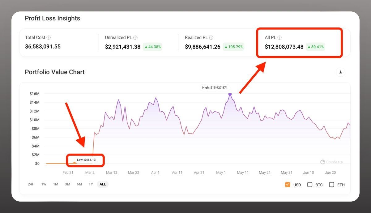 Ce trader a commencé son aventure dans la crypto avec un portefeuille de seulement 464$ le 24 février. En moins d’un mois, son capital avait explosé à 14,6 millions de dollars, grâce à une stratégie habile et à l’achat anticipé de quelques meme coins particulièrement rentables. Son profit total actuel s’élève à 12 808 073 $.