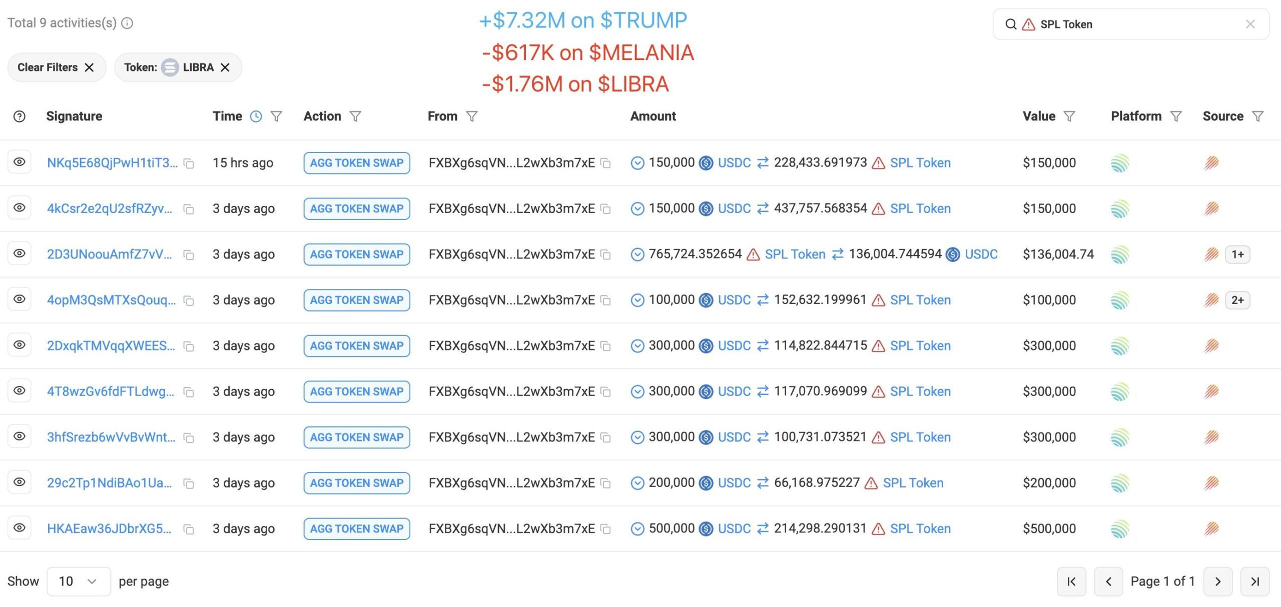 Dans un premier temps, il a encaissé une perte de 1,56 million de dollars sur la crypto de Milei. Puis, voyant un rebond, il a tenté de rentrer à nouveau… pour perdre 200 000 dollars supplémentaires. Au total, 1,76 million de dollars partis en fumée sur LIBRA. En additionnant ses échecs sur MELANIA et LIBRA, l’addition monte à 2,377 millions de dollars.
