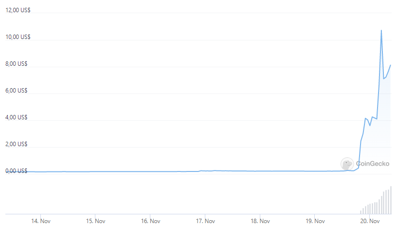 Selon les données de CoinGecko, la crypto SONM (SNM) se négocie à 8,12 $, après une augmentation de plus de 4 000 % entre le 21 et le 22 novembre.