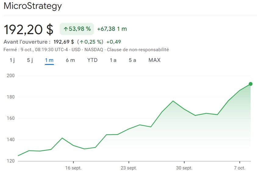SponsoredAlors que l’ouverture au trading se prépare, le MSTR renouvelle sa hausse avec un gain de 3,28 % en pré-session. Désormais, il faudra débourser la bagatelle somme de 192,20 $ pour se procurer dans son entièreté une action appartenant à MicroStrategy.