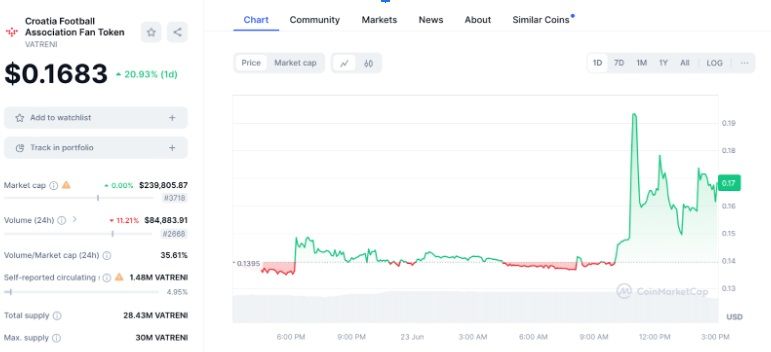 Pour l’Euro, aucune grande nation n’a encore subi de revers dramatique. Ainsi, rien n’a encore réellement pu provoquer une forte réaction sur la valeur de ses fan tokens. Néanmoins, malgré un début de compétition mitigé, le fan token de la Croatie affiche une hausse de 22,53% sur le marché. De son côté, le jeton de l’Espagne, avec deux victoires à son actif, a chuté de 0,56% sur les 24 dernières heures..