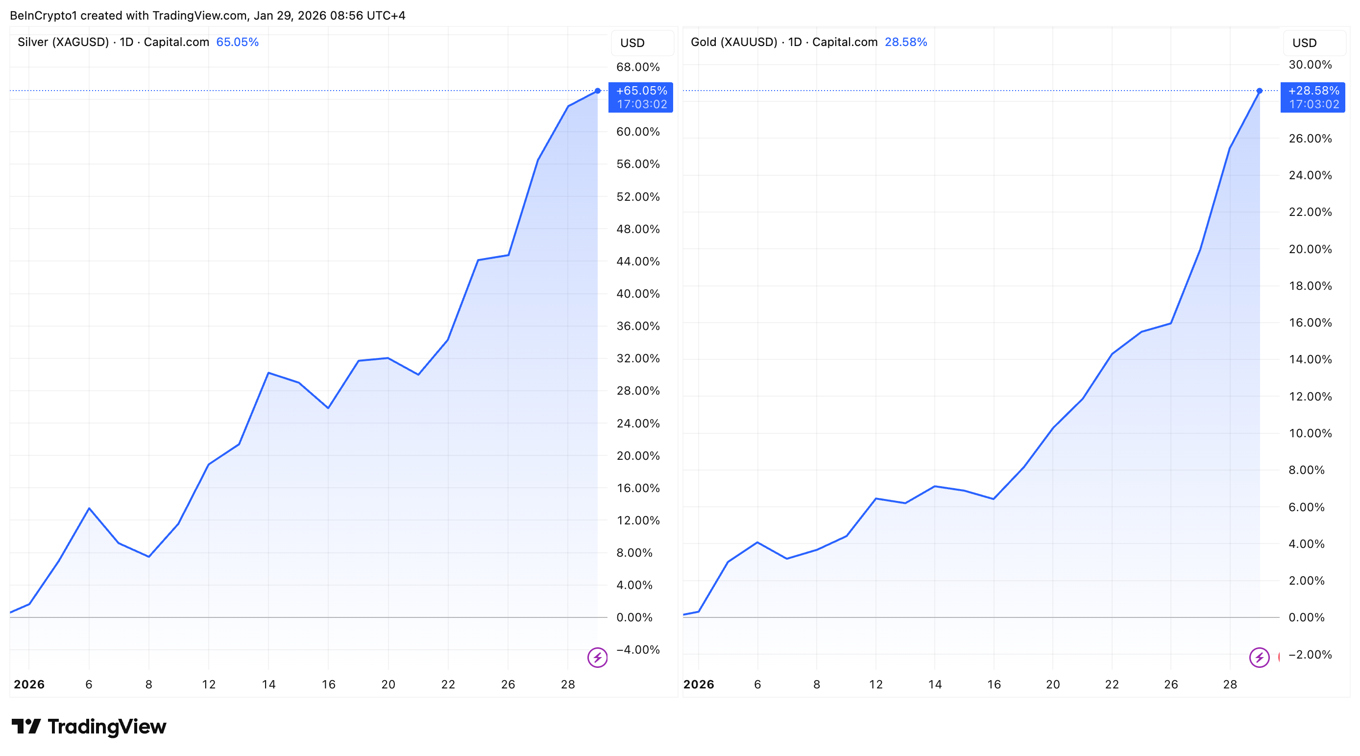 Charles Edwards de Capriole Fund appelle toutefois à la prudence : le cycle haussier des métaux pourrait se prolonger bien au-delà du printemps. Le niveau record atteint par l’or et l’argent rend néanmoins plausible qu’un simple rééquilibrage de portefeuilles déclenche une vague haussière majeure sur le marché crypto.