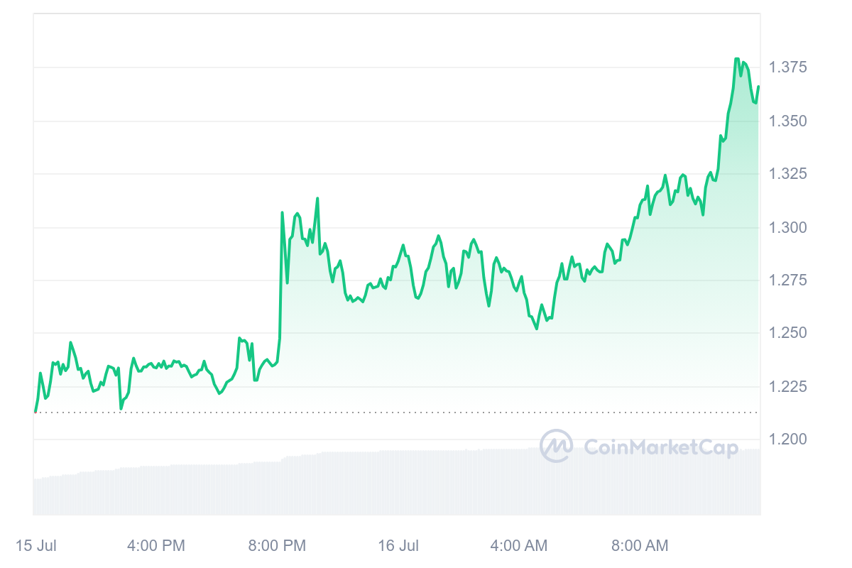 SponsoredSur les dernières 24 heures, le jeton de Mantra s’est fortement revalorisé avec une hausse globale de 12,46 %. En conséquence, le prix d’OM poursuit son ascension avec un prix d’échange actuel de 1,36 $. Le dernier ATH en date a été lui fixé à 1,38 $, soit 1,81 % plus haut.