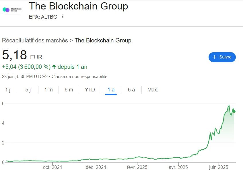 En effet, puisque de son côté, Metaplanet a avalé la hausse après avoir mis en place sa trésorerie Bitcoin. L’action de la société japonaise est notamment en hausse de 1 621 % sur un an. Mais encore, la société française The Blockchain Group a fait encore bien mieux, faisant passer Metaplanet pour un amateur. Sur un an, les gains de l’action ALTBG sont de 3 600 % dont 1 518 % rien que pour l’année 2025.