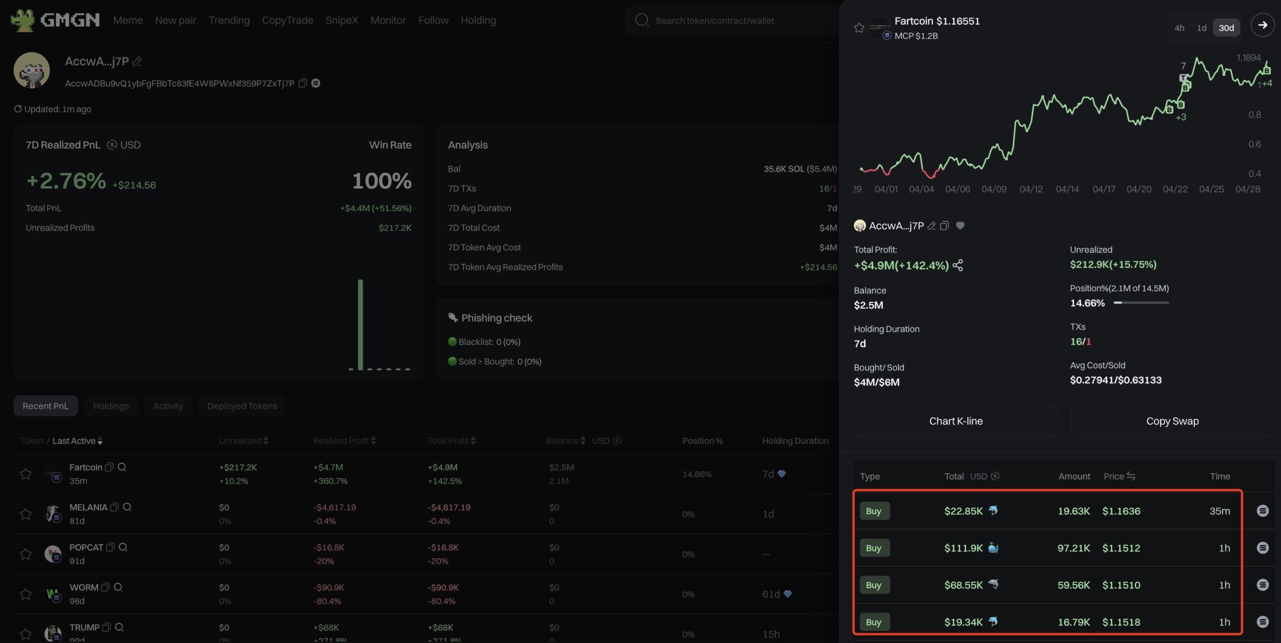 Mais ce n’est pas tout. Plutôt que de se contenter de cette belle performance, il a réinvesti une partie de ses gains dans Fartcoin, en achetant 488 000 tokens supplémentaires pour un montant de 563 000 USDT. Résultat : il détient désormais 2,12 millions de Fartcoin, soit une valorisation actuelle de 2,48 millions de dollars. Ce trader démontre ainsi l’art de maximiser ses gains en réinvestissant au moment où le marché est encore sous-exploité.