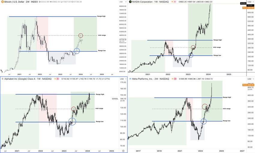 Le dernier crypto trader à avoir su prédire le mouvement du BTC est DamskoTrades. Il a tweeté un graphique du 7 février montrant le cours de l’actif sous la forme d’une fractale comparée aux prix des entreprises technologiques telles que Google et Meta. La fractale prédisait ainsi que le BTC allait dépasser le milieu de sa fourchette et se rapprocher de la partie supérieure de cette dernière.