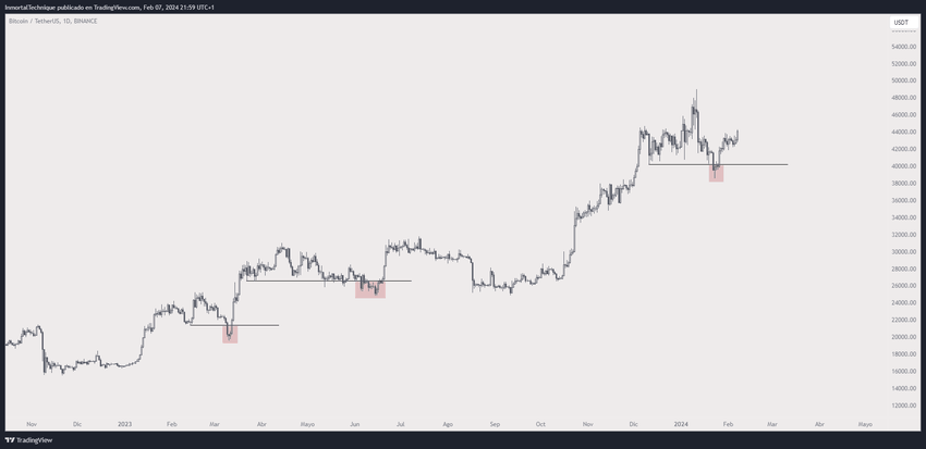 Le 7 février, InmortalCrypto a tweeté un graphique de Bitcoin qui montrait une déviation du cours en-dessous d’une zone de support horizontale clé. En le comparant aux précédentes fois où cela s’était produit, il a prédit que le BTC augmenterait fortement après la déviation.