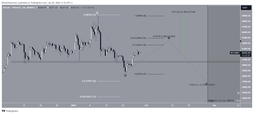 Le cours du BTC a alors augmenté depuis le 23 janvier, date à laquelle il s’est écarté de la zone de support horizontale de 40 000 dollars (en vert). Au lieu de s’effondrer, le BTC a alors regagné la zone trois jours plus tard et a depuis accéléré sa hausse. Ce mouvement haussier pourrait constituer une augmentation en cinq vagues. Si c’est le cas, le BTC se trouverait alors dans la cinquième et dernière vague de ce mouvement haussier.