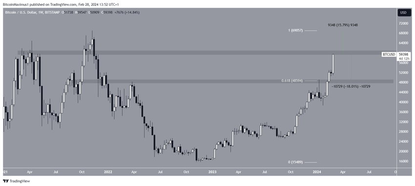 Une percée au-dessus de cette zone pourrait alors conduire à une croissance de 16 % jusqu’à son sommet historique de 69 000 $.