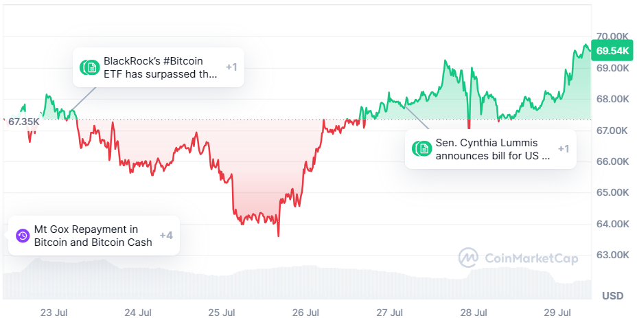 Ainsi, la participation de Donald Trump à l’événement n’est pas passée inaperçue. Celui-ci a fait une promesse inattendue qui a reboosté le BTC aux alentours des 69 000 $, avec l’objectif de dépasser les 70 000 $ dans les jours à venir.