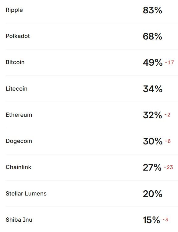 Malheureusement, là aussi, les probabilités autour du BTC sont en baisse, alors que celle du XRP grimpent une nouvelle fois. Pour les autres actifs de cette liste, les probabilités sont dérisoires, avec des scores compris entre 3 % et 7 % pour un Litecoin qui se situe comme la troisième meilleure option.