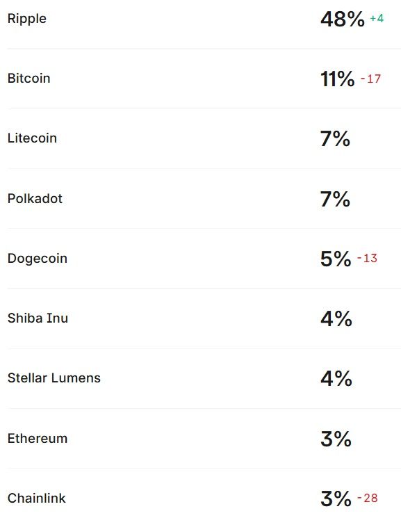 En parallèle, le XRP de Ripple est logiquement donné gagnant en termes de probabilités à la question suivante : “Laquelle de ces cryptomonnaies fera la meilleure performance cette année”. Le jeton est donné gagnant avec 48 % de probabilités qui vont en sa faveur. Il devance un Bitcoin qui est loin derrière avec seulement 11 % de probabilités d’être la meilleure cryptomonnaie cette année au sein d’une liste pourtant peu glorieuse actuellement.