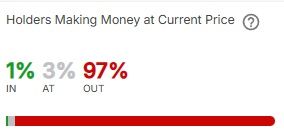 En effet, puisque du côté du Worldcoin, les temps sont mauvais, avec un prix actuel qui est retombé bien bas. En un an d’intervalle, les différences sont fortes pour le WLD, qui est donc passé en plein bull market d’un prix supérieur à 10 $ à un prix actuel de seulement 1,24 $. En conséquence, les perdants sont nombreux, avec 97 % des investisseurs qui sont “Out the money”.