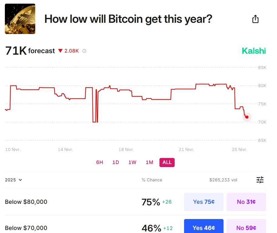SponsoredAlors que certains analystes se penchent maintenant sur la baisse du côté du Bitcoin, c’est aussi le cas pour les parieurs de Kalshi. A la question de l’objectif de prix baissier du BTC sur le reste de l’année, on remarque que l’objectif de prix va de plus en plus bas. En effet, puisque les 71 000 $ sont dans la ligne de mire, alors que le plus bas annuel attendu était situé à approximativement 80 000 $.