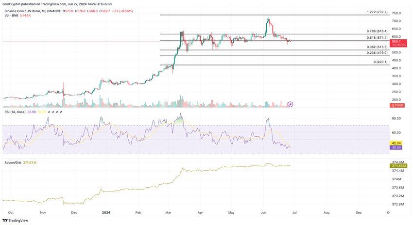 BNB, la crypto native de Binance, est une des seules grosses market cap à avoir surpassé son précédent record. Après avoir atteint un sommet de 720,67 $ le 6 juin dernier, l’actif a perdu 21,11 %. Auparavant, BeInCrypto avait souligné que le BNB se négociait en dessous des moyennes mobiles essentielles tout en peinant à se redresser.