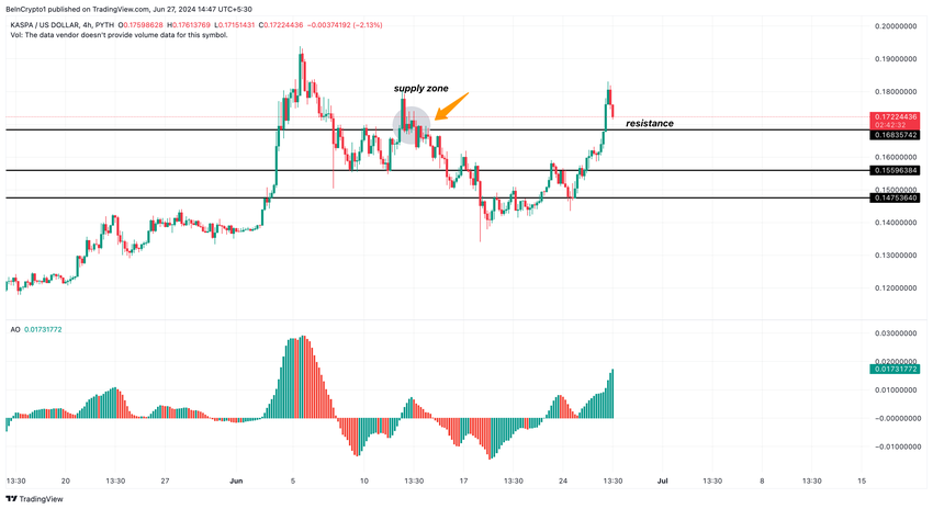 Les chandeliers rouges sur le graphique indiquent cette faiblesse. Ainsi, le prix de KAS pourrait retester les 0,16 $ avant d’entamer un possible rebond. Si cela se produit, la valeur de la cryptomonnaie pourrait potentiellement atteindre 0,20 $ en juillet.