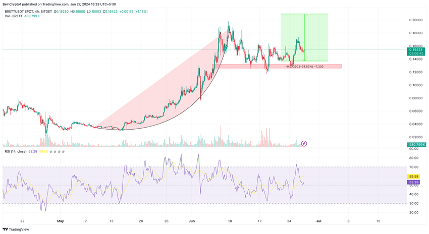 En dernier lieu, nous abordons BRETT, une des cryptomonnaies phare du moment. Le meme coin a été conçue sur le réseau layer-2 de Coinbase, Base. Le graphique sur quatre heures révèle que BRETT a dessiné un modèle parabolique du 9 mai au 9 juin, période durant laquelle son prix a grimpé de 0,033 $ à 0,19 $.