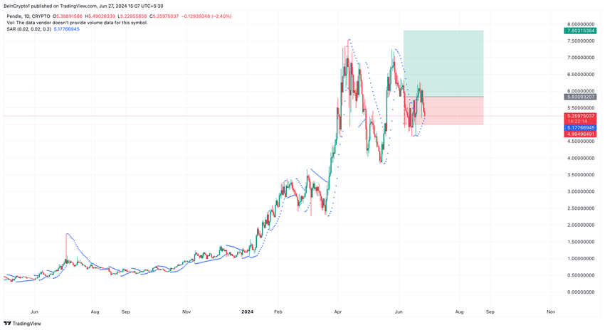Actuellement, le Parabolic SAR indique que PENDLE pourrait prochainement se redresser après avoir touché ses niveaux les plus bas. Cette situation pourrait représenter une opportunité d’achat pour les acteurs du marché. Dans ce scénario, le cours de PENDLE pourrait s’élever à 7,80 $ d’ici la fin du mois suivant.