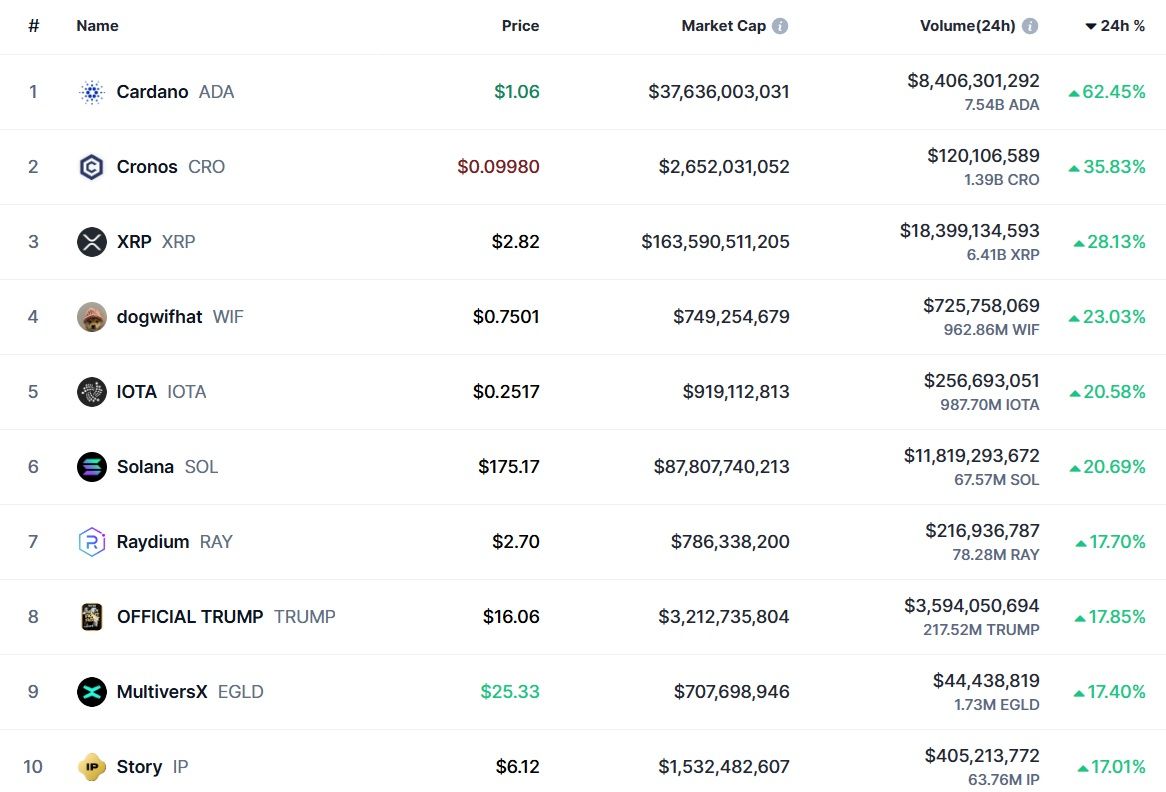 Du côté des plus grands gagnants, on retrouve aussi deux autres altcoins qui ont été mentionnés par Donald Trump, avec le XRP (28,13 %) et le SOL (20,69 %) respectivement 3ème et 6ème du jour.