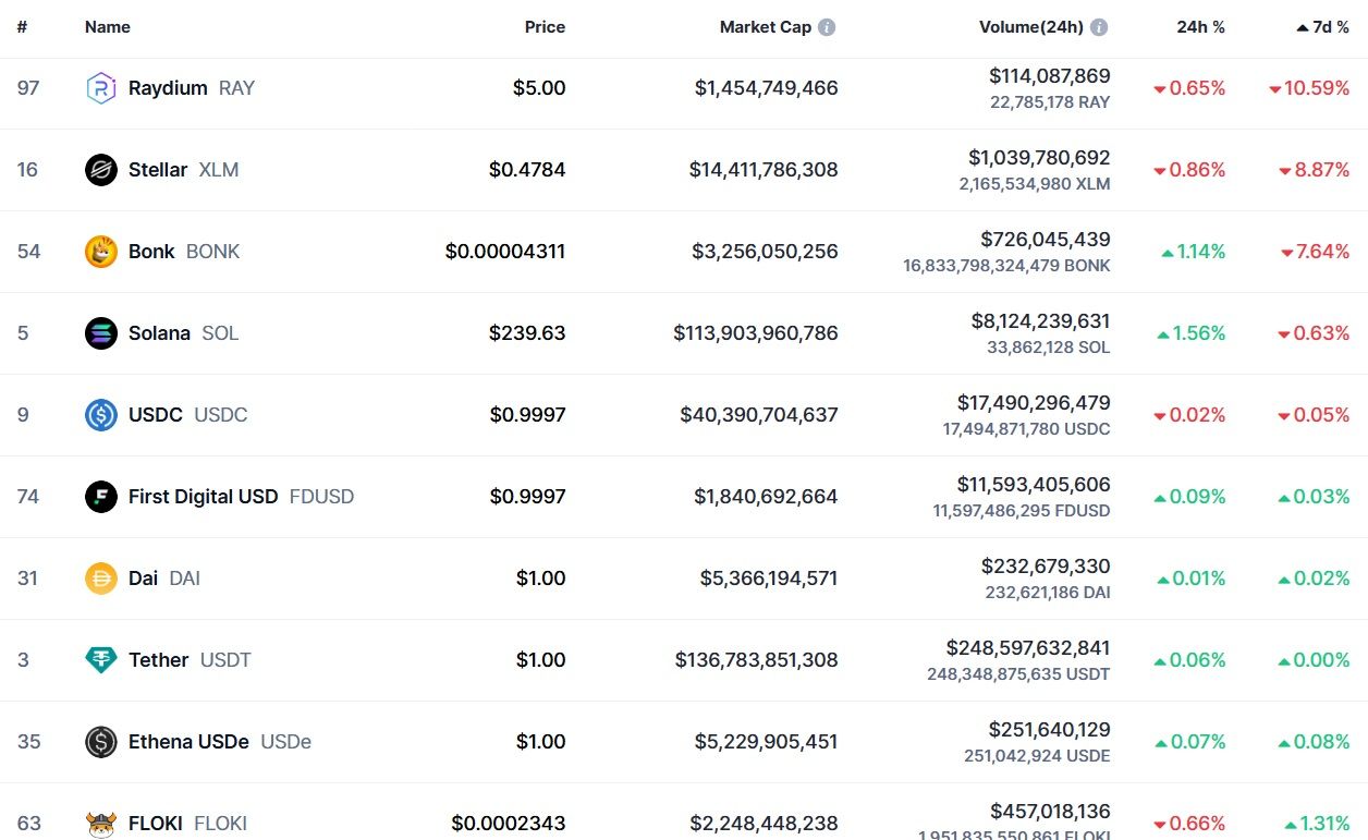 Au total, on ne retiendra que 4 cryptomonnaies dans le rouge sur la semaine qui vient de s’écouler. Nos pensées vont donc avec Solana, Bonk, Raydium et le XLM de Stellar. Tiens, tiens, tiens, sauf le XLM, les autres proviennent du même écosystème et de la même blockchain…