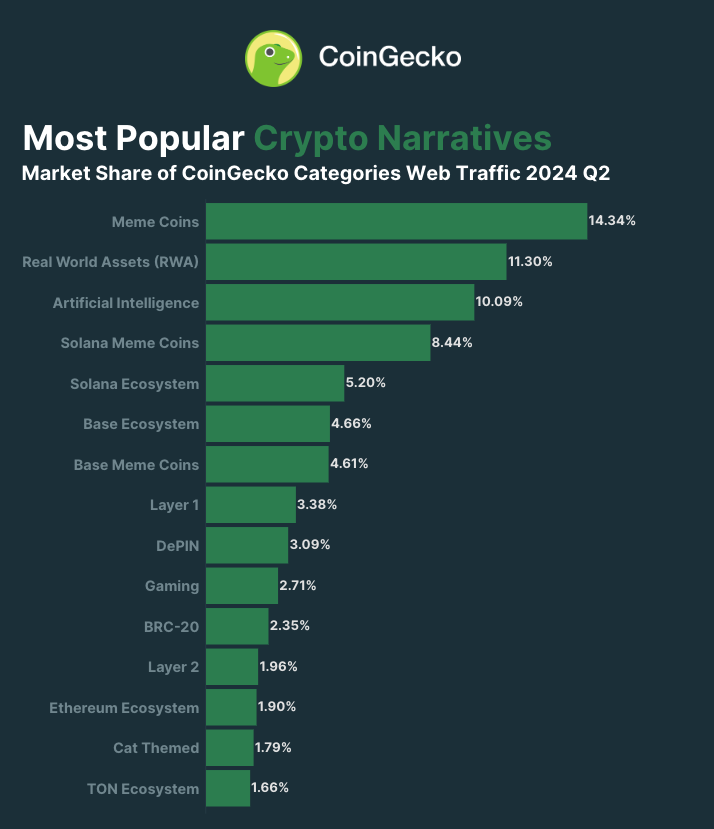 Au cours du deuxième trimestre de l’année 2020, le secteur des cryptomonnaie a révélé un changement de paradigme avec de nouvelles tendances qui se sont portées au premier plan. Bien que la capitalisation globale du marché ait reculé de 14,4 %, certaines narratives se démarquent et laissent espérer le mieux pour la fin d’année. C’est notamment le cas des meme coins, des RWA, des cryptos IA ou encore des DePIN.