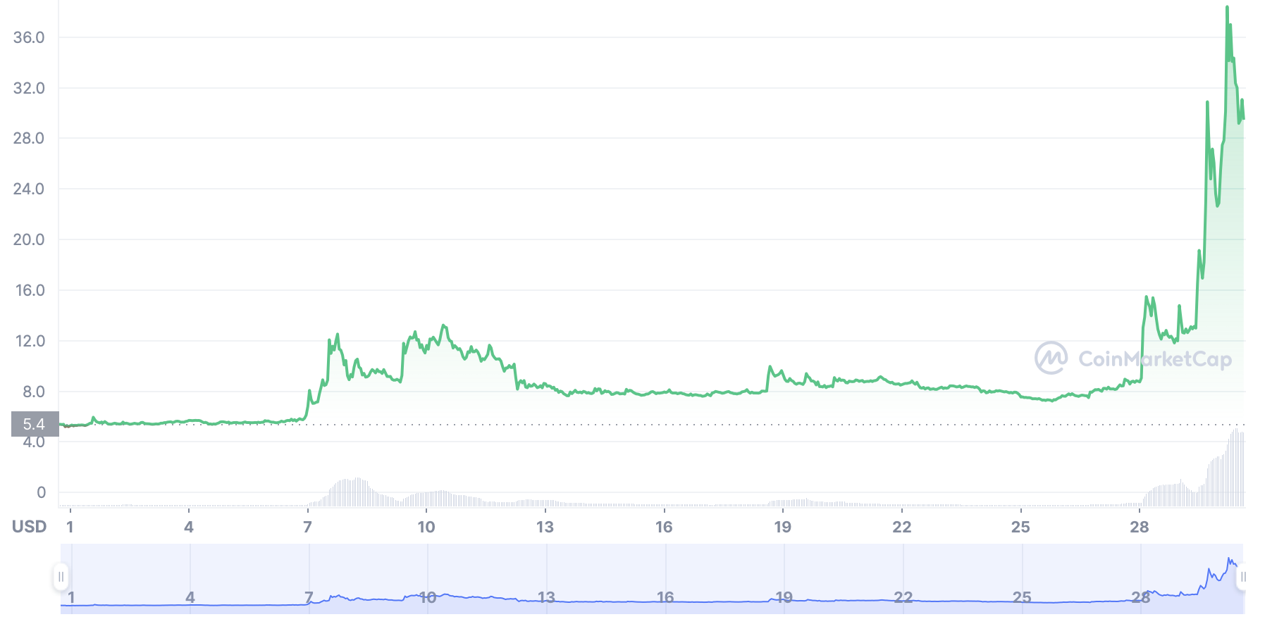 Cette crypto a connu une ascension fulgurante pendant le mois de juillet. Son cours a en effet progressé de 642,59% sur le mois. Comme vous pouvez le constater d’après le graphique, sa hausse survient à la fin du mois. Sur les trois derniers jours (du 28 au 31 juillet), le cours du BTCST est passé de 12 $ à 40 $ pour ensuite chuter vers les 29,17 $. Il est clair que la crypto a connu une extrême séquence de volatilité.