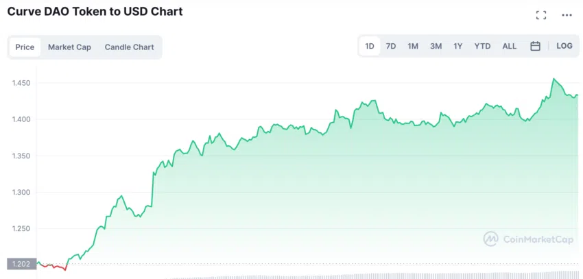 Ainsi, en l’espace de 24 heures, le jeton Curve DAO (CRV) a augmenté de plus de 20 % pour dépasser 1,45 $ par token.