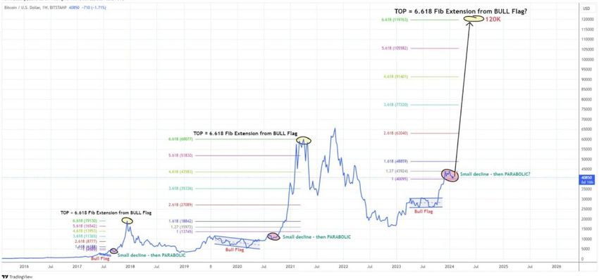 L’analyste utilise le retracement de Fibonacci (Fib) externe pour établir une cible potentielle pour la hausse de Bitcoin durant son cycle actuel. Il a observé que dans les deux cycles précédents, le pic du marché haussier a été atteint à l’extension Fib de 6 618. Ainsi, si l’histoire devait rimer, le niveau de 120 000 dollars constituerait une bonne cible pour le prix du BTC.