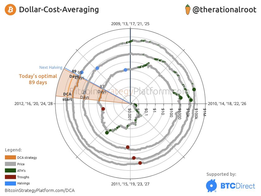 Indépendamment d’une prédiction spécifique du cours de Bitcoin au sommet de son prochain bull market, il semble que la correction actuelle de l’actif puisse constituer une excellente opportunité d’achat. Un autre analyste, @therationalroot, affirme que la période d’environ trois mois avant le halving représente la meilleure occasion d’utiliser une stratégie d’achats périodiques par sommes fixes (DCA).