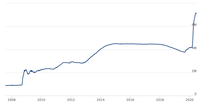 Ce projet de loi a mis le bilan de la Fed en orbite, les fonds passant d’un peu plus de 4 000 milliards de dollars à bien plus de 7 000 milliards de dollars en quelques jours. Beaucoup considéraient les actions nécessaires pour protéger le bien-être américain. D’autres, cependant, ont vu le paiement comme un acte de garantie politique au cours d’une année électorale.