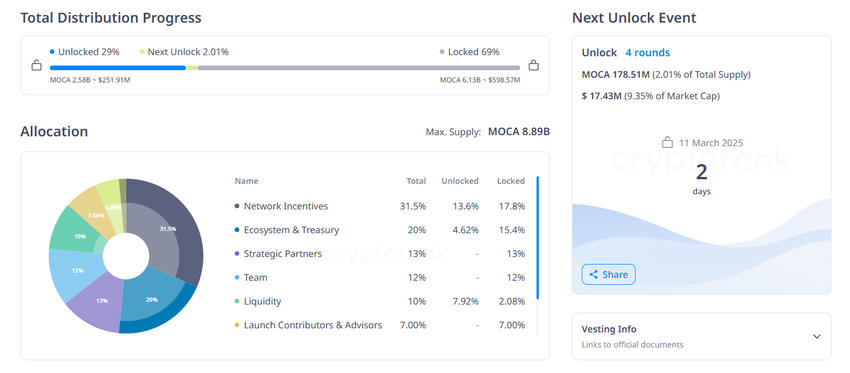 Le déblocage de cette semaine, de 178,51 millions de tokens MOCA (évalués à 17,36 millions de dollars), représente 9,34 % de sa capitalisation boursière. La plus grande part, environ 93,32 millions de MOCA, sera allouée aux incitations du réseau.