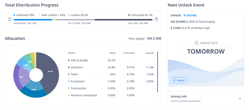 Le 9 mars, le réseau Xai a débloqué 35,89 millions de tokens XAI, évalués à environ 2,62 millions de dollars. Le réseau a alloué la plus grande partie de ce déblocage, soit environ 17,33 millions de tokens XAI, à ses investisseurs. De plus, 11,9 millions de tokens sont destinés à l’équipe du projet.