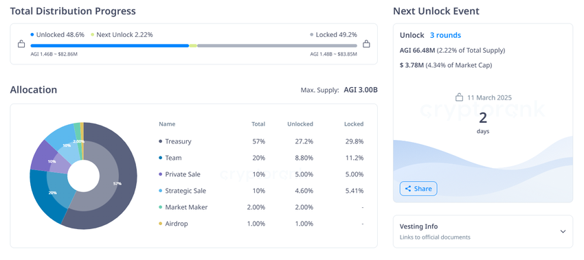 - Nombre de tokens débloqués : 66,48 millions d’AGI (2,22 % de l’offre maximale)