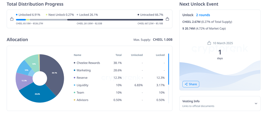 - Nombre de tokens débloqués : 2,67 millions de CHEEL (0,27 % de l’offre maximale)