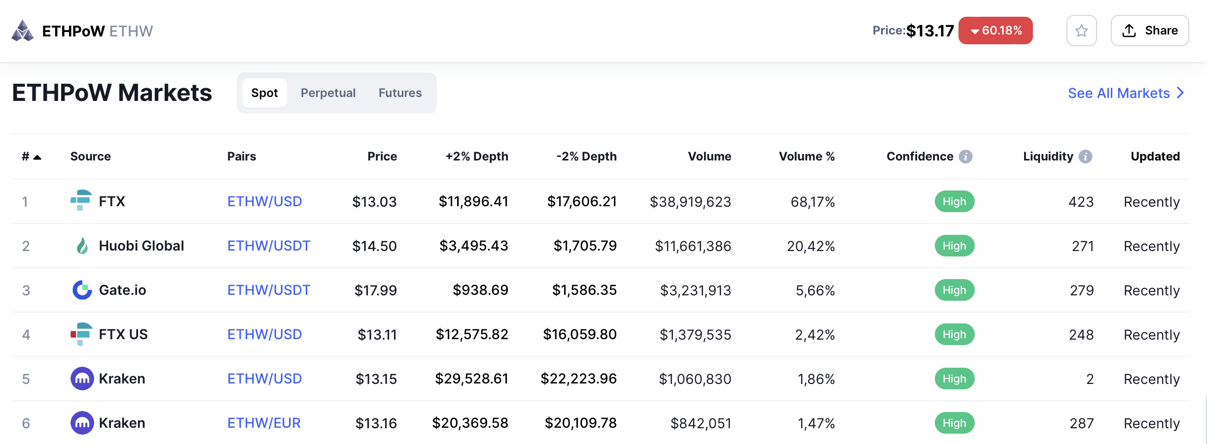 Pourtant, les exchanges supportent l’ETHPoW. Suivant les informations recueillies sur Coinmarketcap et Coingecko, les exchanges crypto ByBit, FTX, Kraken BitFinex, gate.io et Huobi Global permettent tous d’acheter le jeton du fork d’Ethereum.