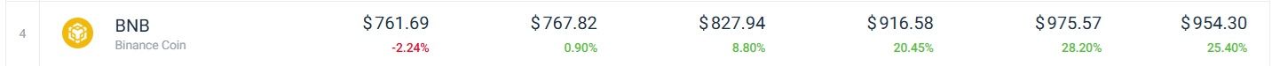 D’autant plus que les prédictions haussières sont de retour pour le BNB de Binance, avec notamment CoinCodex qui s’attend à une hausse de prix conséquente d’ici les prochaines semaines. Cependant, les 1 000 $ ne sont mas pentionnés par la plateforme de prédictions de prix qui se “contente” d’annoncer un prix compris entre 916 $ et 975 $ pour les 6 prochains mois.