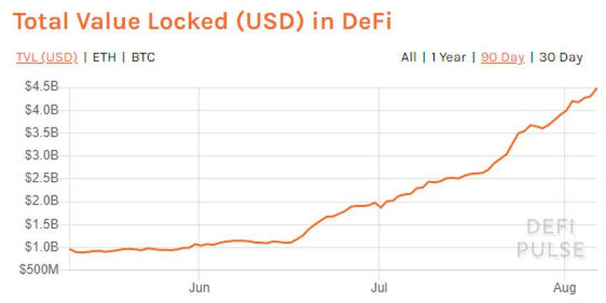 Selon DeFi Pulse, le nouveau sommet atteint au 6 août était de 4,47 milliards de dollars. Au cours des 30 derniers jours, les marchés de DeFi ont connu une croissance de 85 % en termes de valeur totale bloquée (TVL).