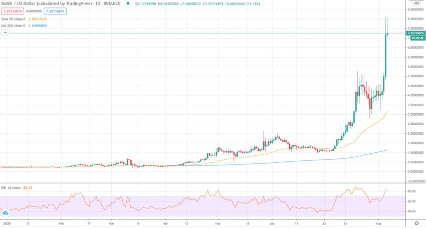 Comme au début du boom de la cryptomonnaie, le cours des jetons BAND a augmenté de 52 % dans la journée, pour atteindre un sommet historique à 7,90 $. BAND a été l’un des jetons les plus performants de cette année avec une époustouflante hausse de plus de 3 250% depuis le début de l’année 2020.