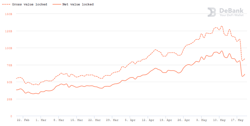Le marché de la DeFi s’est effondré au cours des dernières 24 heures, la valeur totale bloquée (TVL) ayant chuté de 39% par rapport au pic du 11 mai. Ce jour-là, la TVL était d’environ 131 milliards de dollars, selon DeBank.