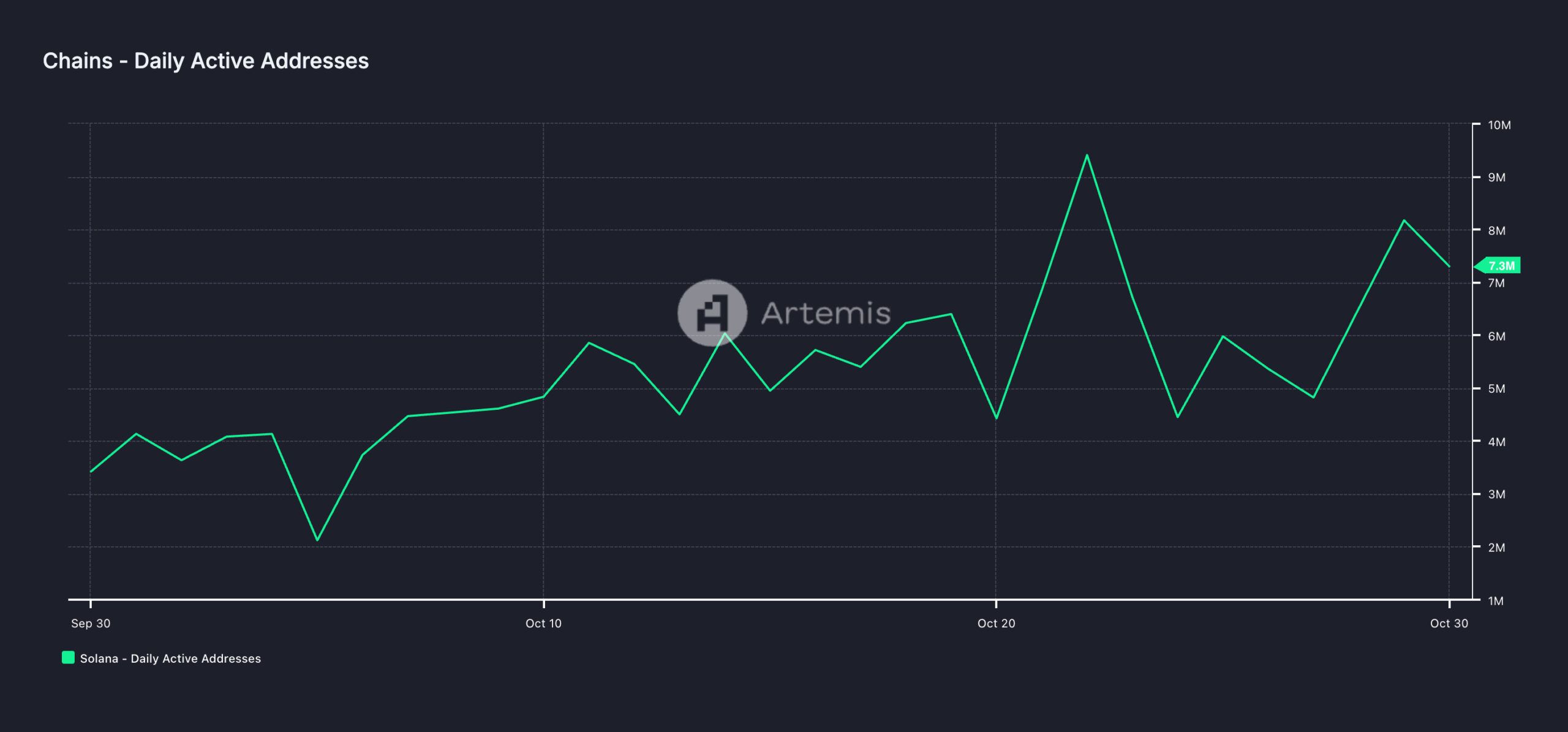 En octobre, la demande des utilisateurs sur Solana a explosé, comme en témoigne la hausse de ses adresses actives quotidiennes. Pendant cette période de 31 jours, le nombre d’adresses uniques ayant signé des transactions sur le L1 a en effet atteint 123 millions, son plus haut niveau depuis le début de l’année, représentant une hausse de 41 % par rapport aux 86 millions d’adresses uniques de septembre.